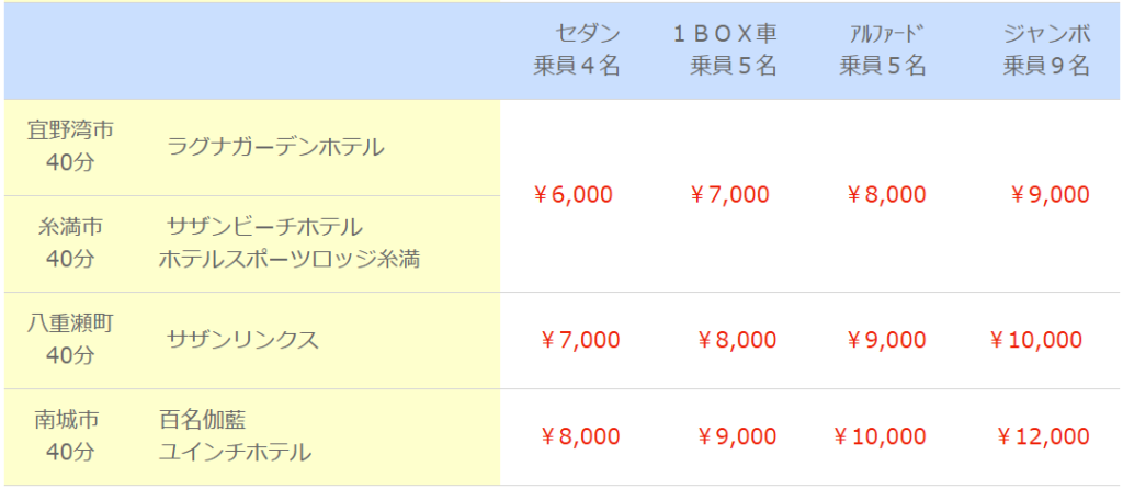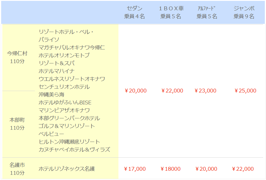 ※下記の料金表は那覇空港または那覇市内のホテルからの出発になります。