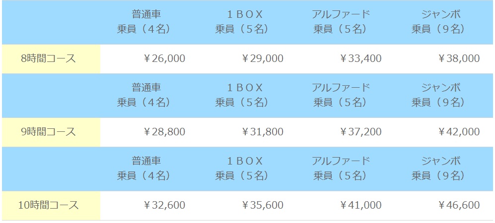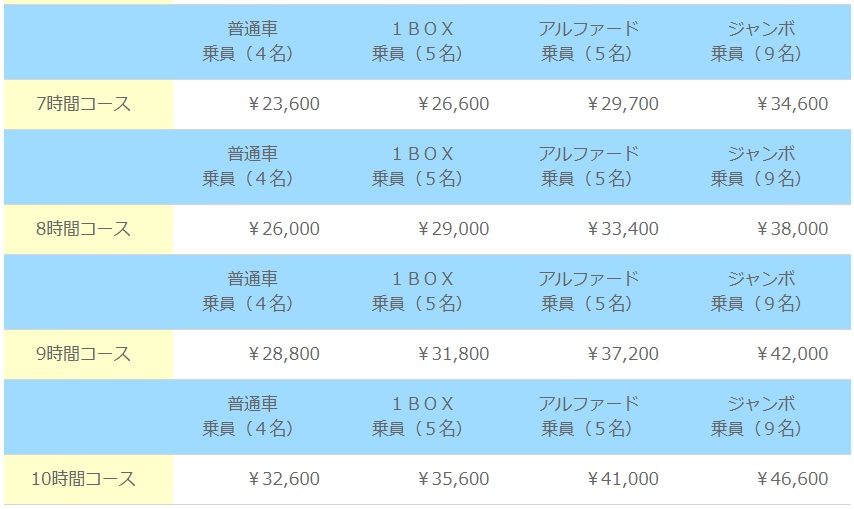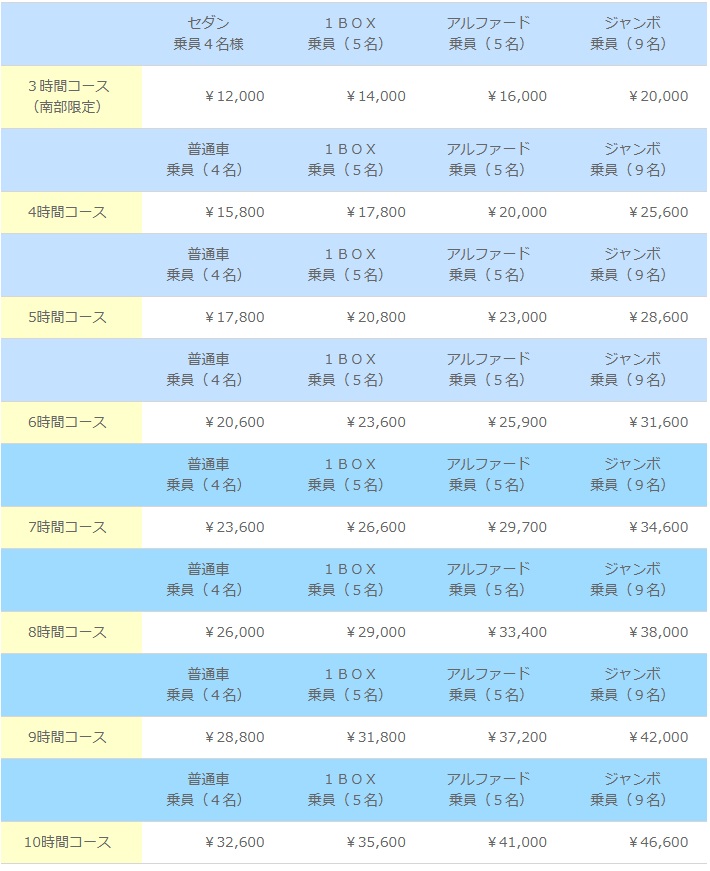 ※下記の貸し切り料金は那覇空港または那覇市内のホテルからの出発になります。